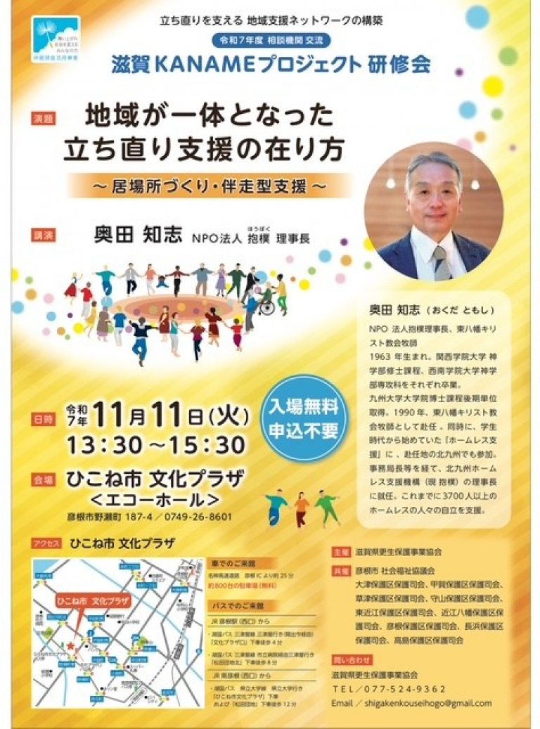 最後に、11月11日に実施される滋賀県更生保護事業協会主催 NPO法人 抱撲(ほうぼく) 奥田知志 理事長の講演会「居場所づくり・伴走型支援 地域が一体となった立ち直りの支援の在り方」もPRさせていただきました。