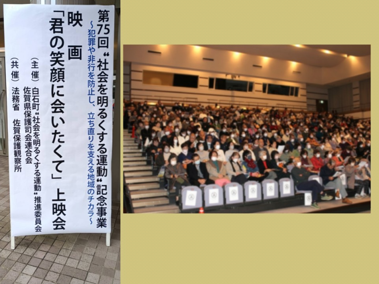 令和7年12月13日(土)午後1時半から有明スカイパークふれあい郷自有館において、保護司、更生保護関係者及び一般の方等、約600名にご参加いただき、映画「君の笑顔に会いたくて」上映会が行われました。