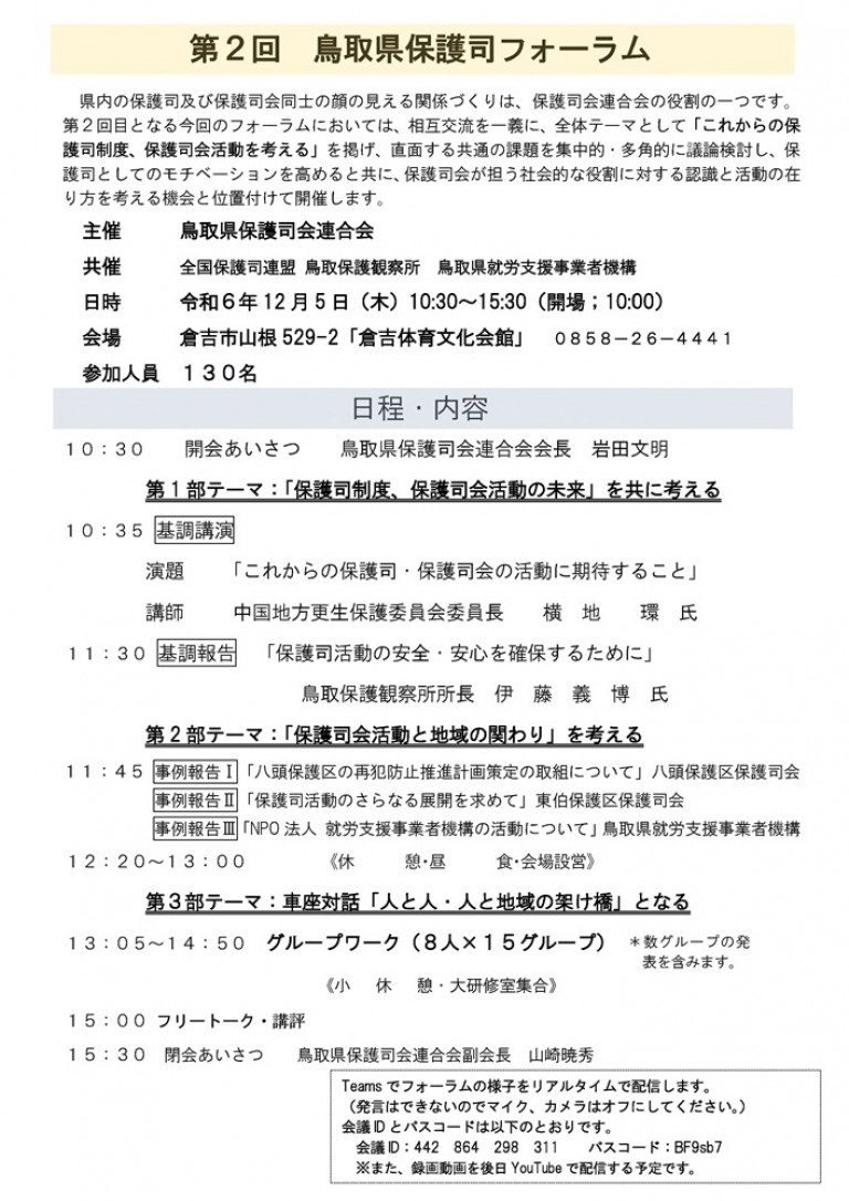 昨年12月に県内8保護区の交流、情報交換などを目的にした第1回保護司フォーラムを開催した。80有余名の参加であったが、初めての取組で活発な意見交換が行われた。又、保護司みらい研究所今福代表の基調講演では保護司制度への新たな認識や視野を広めることができた。本年度も交流研究集会と位置付けて、保護司会の運営の課題や特長的な取組など情報交換を行う。