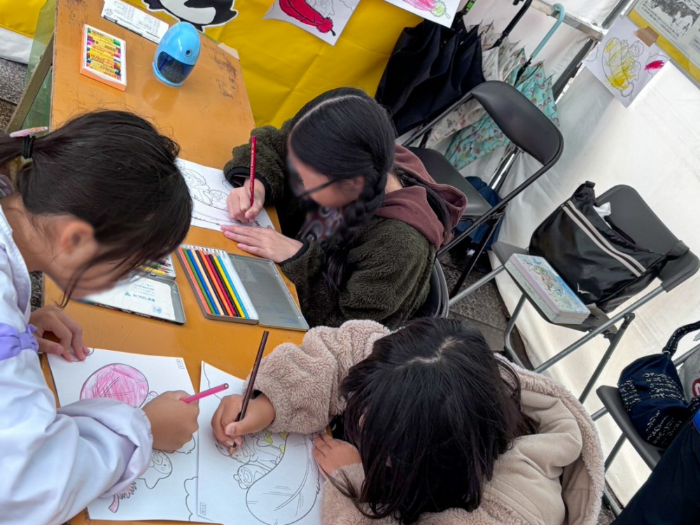 生憎の雨でしたが、子どもたちは真剣に塗り絵に取り組んでくれました。塗り絵の作業が遅れていた弟を、姉たちが手伝う微笑ましい光景もありました。