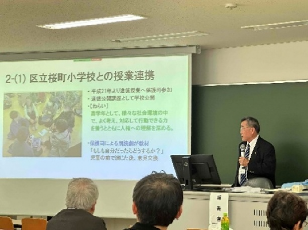 7日の午後には、学会員である世田谷区の保護司有志により、「保護司活動の課題と展望―世田谷区における保護司活動の実践から「持続可能性」を考える―」というテーマでセッション分科会を行いました。保護司3名からそれぞれ、“社会を明るくする運動”、学校との連携活動、適任者確保と現役世代が活動しやすい環境づくりについて発表したほか、世田谷区保健福祉政策課長から保護司会と行政との連携について発表いただき、フロアの研究者や保護司の方々との間で活発な質疑応答が行われました。